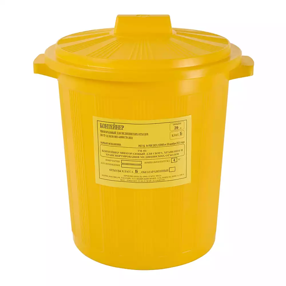 Бак 20,0л ТМ-01 для сбора, хранения медицинских отходов (класс Б), с крышкой сверху, цвет желтый, многоразовыйТарус Медикал (РОССИЯ)