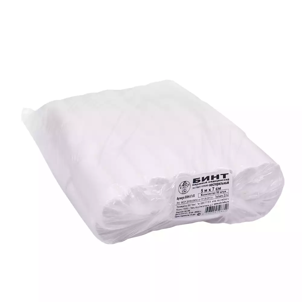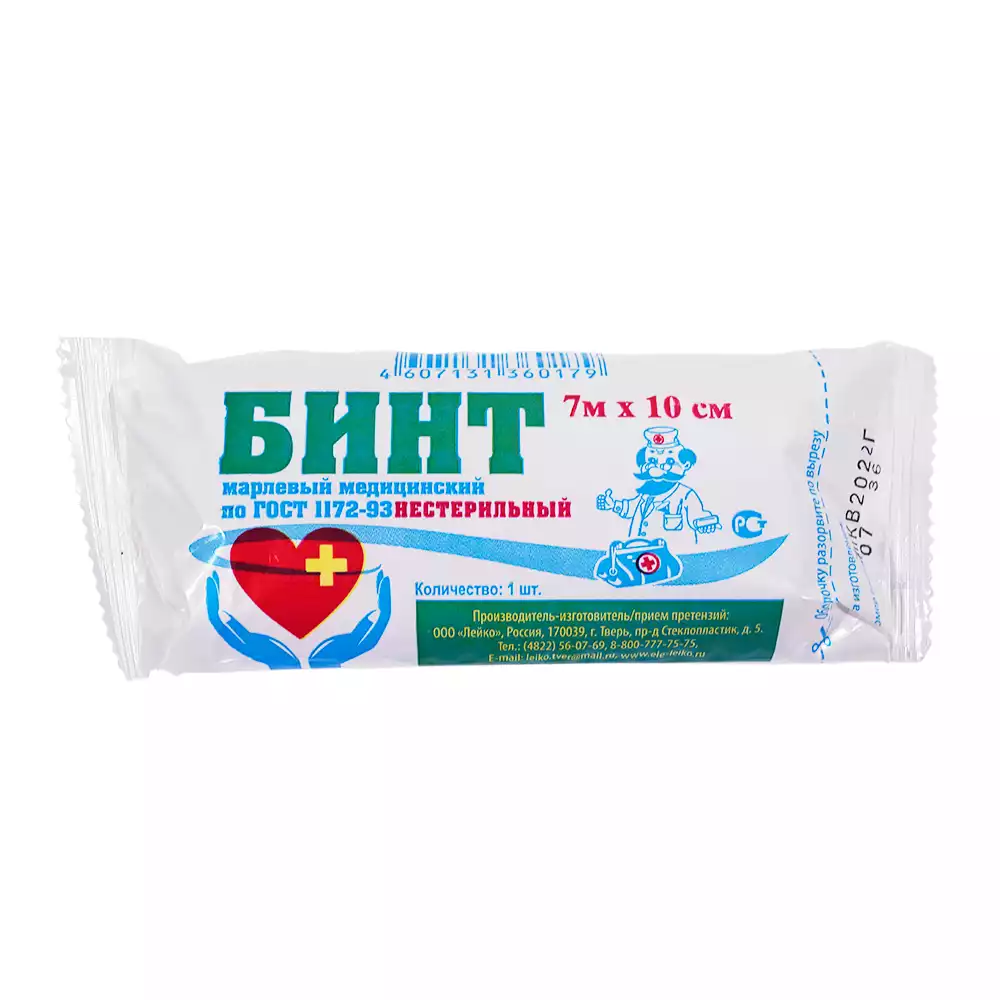 Бинт марлевый, размер 7м*10см, марлевый, плотность 36г/м2, нестерильный, индивидуальная упаковка, Лейко (РОССИЯ)