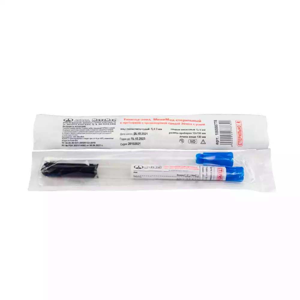 Зонд-тампон для отбора и хранения биологических проб, с пробиркой Amies с углем, стерильный, МиниМед (РОССИЯ)