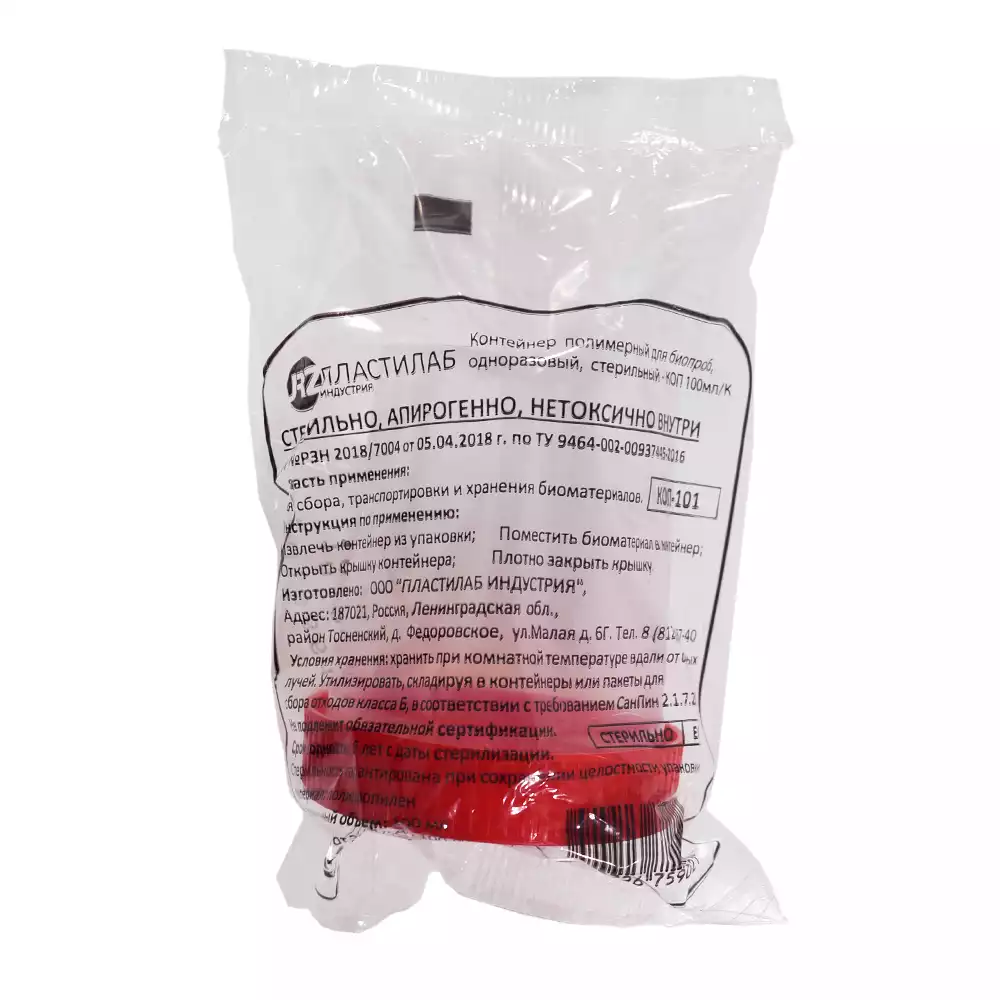 Контейнер 100мл, для взятия биоматериала, стерильный, индивидуальная упаковка, ПЛАСТИЛАБ ИНДУСТРИЯ (РОССИЯ)