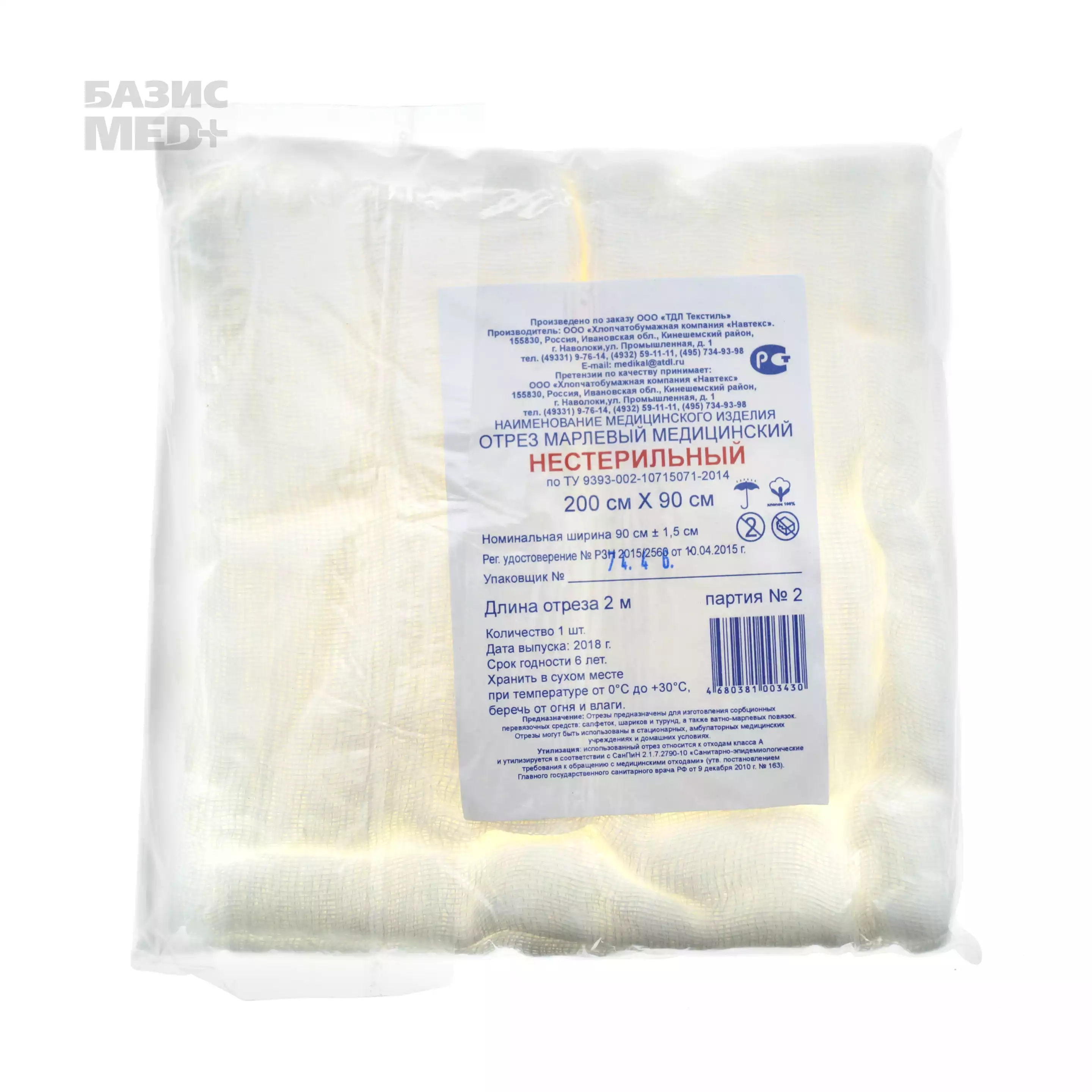 Марля медицинская, ширина 90см, отрез 2м, плотность 36г/м2, Навтекс ХБК (РОССИЯ)