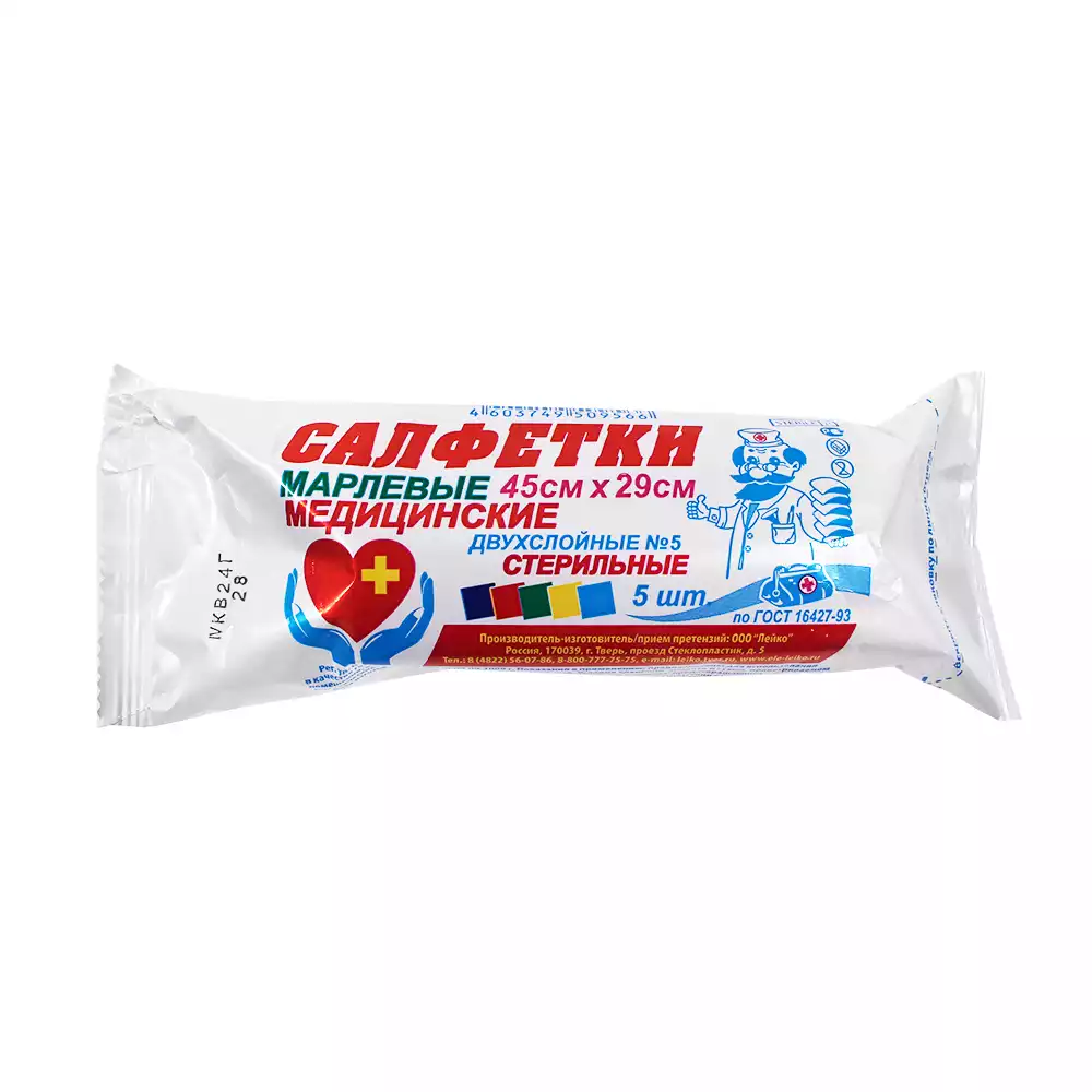 Салфетка марлевая №5, 2-х слойная размер 45*29см Лейко плотность 32г/м2, стерильная, Лейко (РОССИЯ)