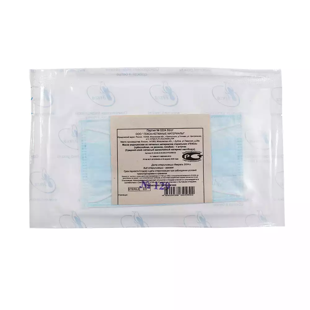 Маска 3-х слойная, с носовым фиксатором 10см, на завязках, нестерильная, голубая, Гекса-нетканые материалы (РОССИЯ), 50 шт