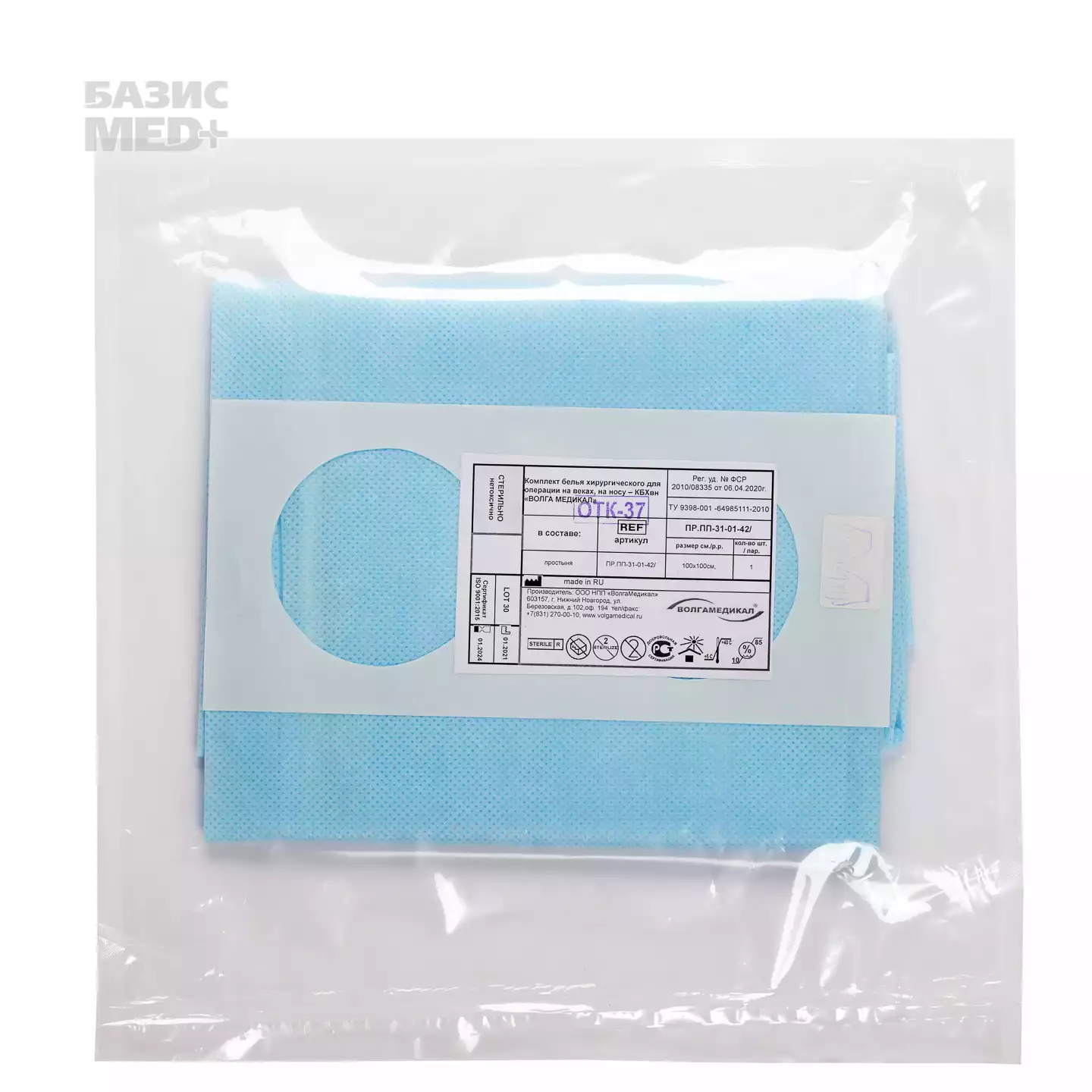 Простыня (наглазник), размер 100*100см, материал СМС 42г/м, с 2-мя отверстиями 7см, с липким краем, 2 внутр. кармана, СМС 42г/м2, стерильная, голубая, Волга Медикал НПП (РОССИЯ)