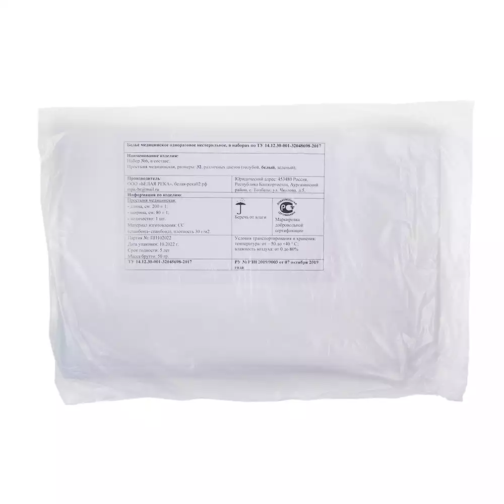 Простыня 80*200см, материал Спанбонд 30г/м2, нестерильная, белая, индивидуальное сложение, Белая река (РОССИЯ)