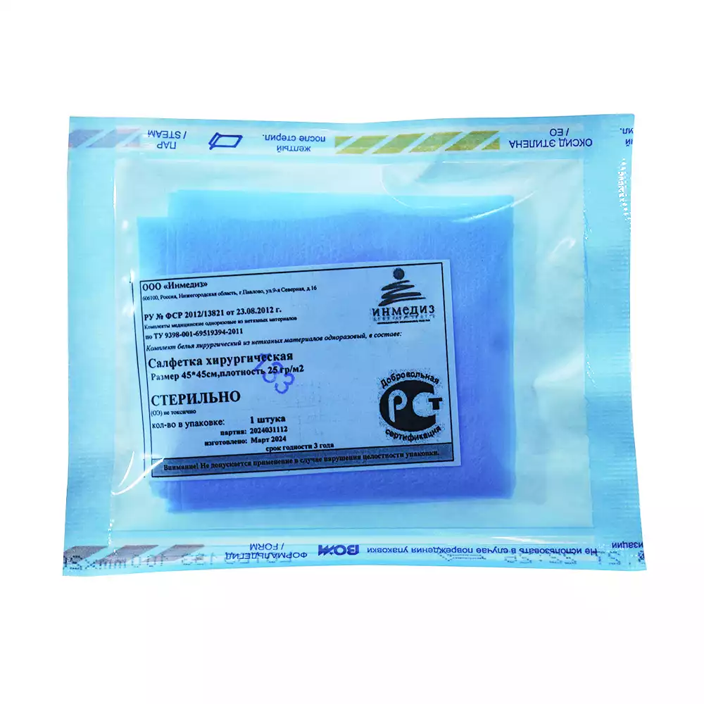 Салфетка 45*45см, материал СМС ламинированный 40г/м2, хирургическая, стерильная, цвет голубой, Инмедиз (РОССИЯ)