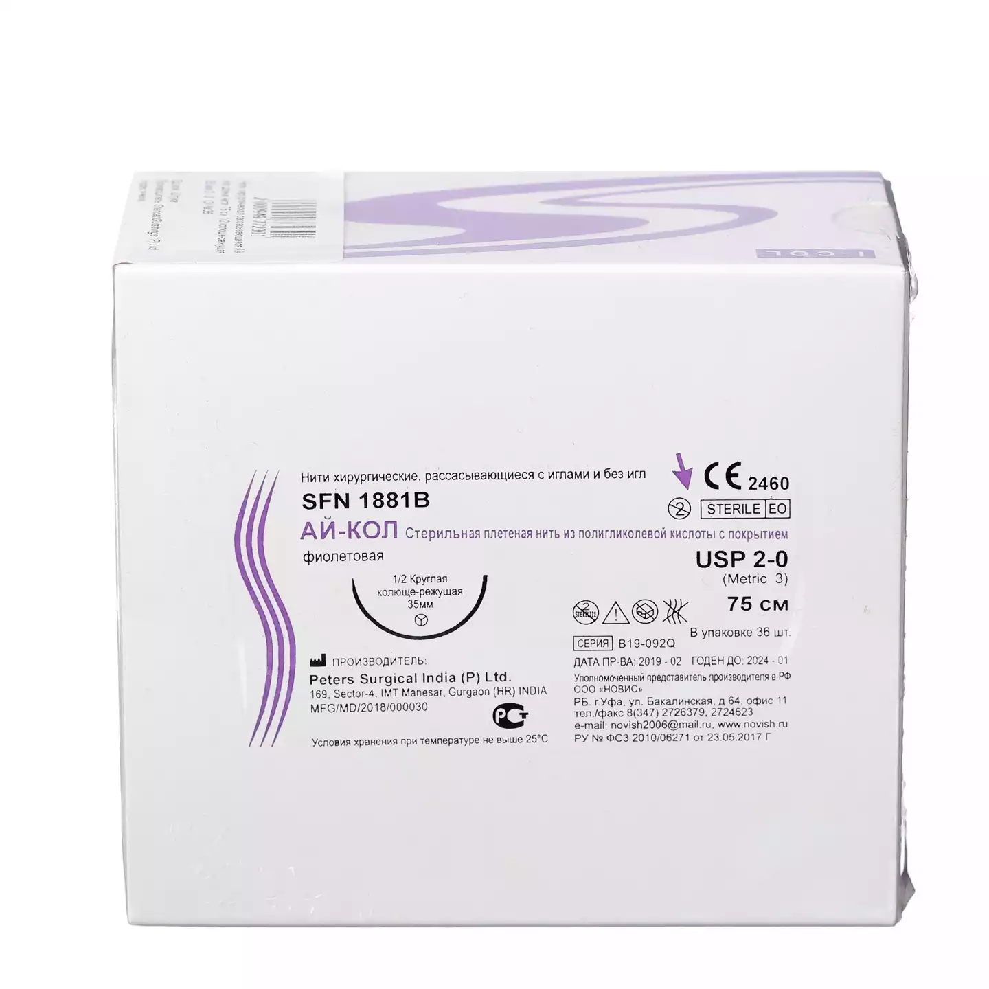 Поликол 0 (3,5), длина нити 90см, игла 1/2 колюще-режущая 36мм, упаковка 36шт, SPL1926, Peters Surgical (ИНДИЯ)