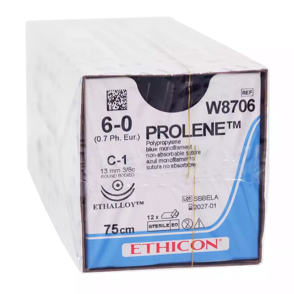 Пролен 6/0 М0,7, длина 75см, две иглы колющие С-1 3/8 окружности 13мм, синий, упаковка 12шт, W8706, ETHICON