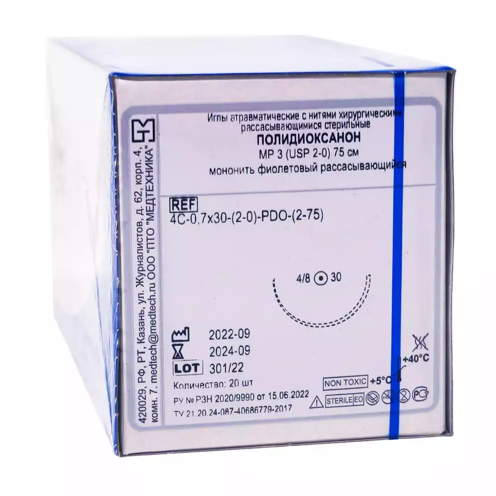 Полидиоксанон мононить USP 2/0 (МР 3), длина нити 75см, 4C-0,7x30-(2-0)-PDO-(2-75) цвет фиолетовый, Медтехника ПТО (РОССИЯ), 20 шт
