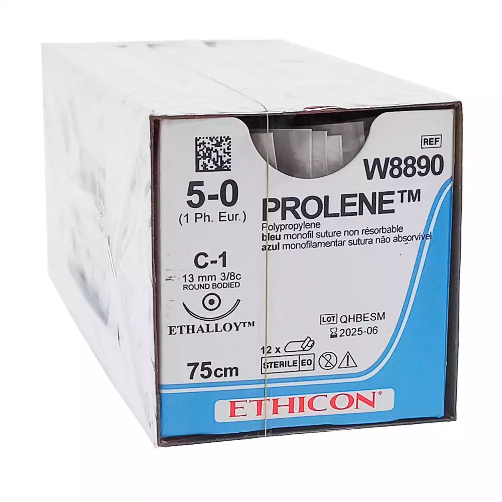 Пролен 5/0, длина 75см, игла колющая С-1 3/8 окружности 13мм, синий, упаковка 12шт, W8890, ETHICON