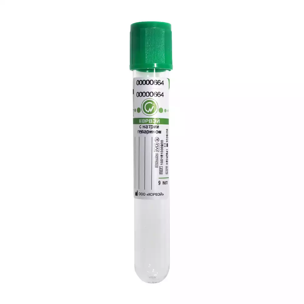 Пробирка КОРВЭЙ для иследования плазмы с натрий гепарином, объем 9 мл, размер 16*100 мм, цвет крышки зеленый, 100 шт
