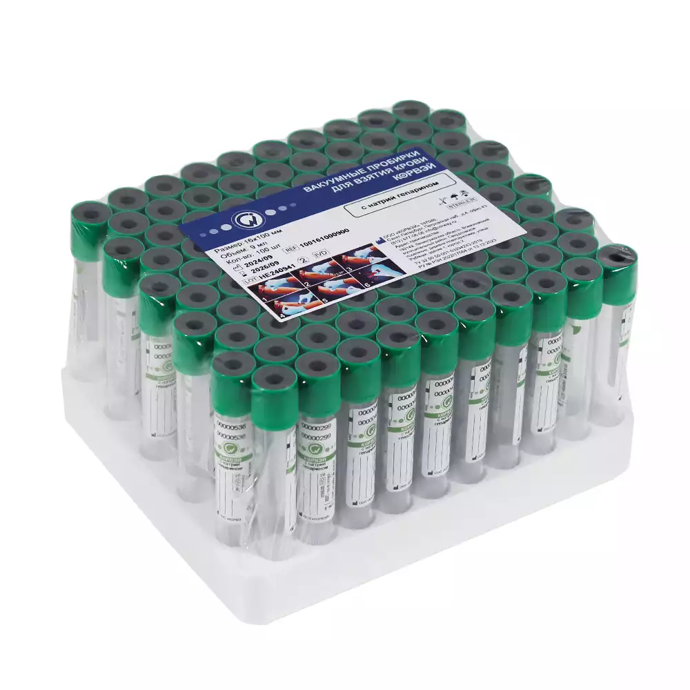 Объем забираемой крови 9мл, размер пробирки 16*100мм, зеленая крышка.